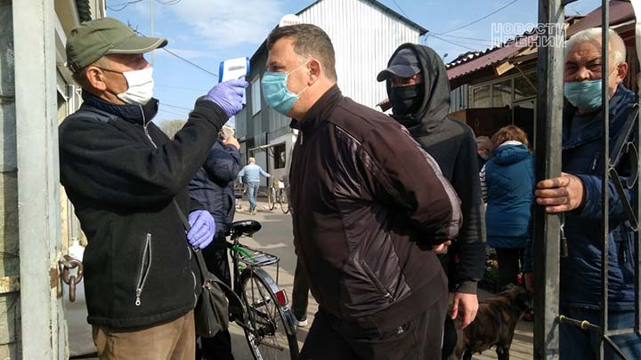 На входе в рынок производится бесконтактный замер температуры и продавцов, и покупателей.