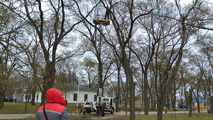 В городе Рени, в парке Победы проводится санитарная очистка деревьев. Этой работой занимается бригада жилищно-коммунального хозяйства.